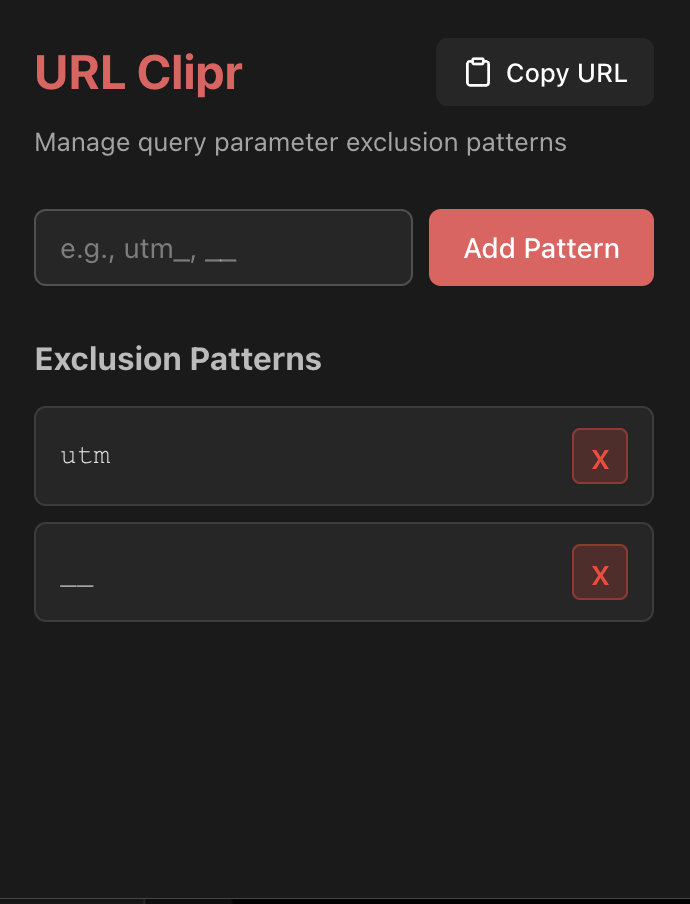 The patterns are stored in local storage and retrieved whenever a URL needs to be cleaned. What surprised me was how much trickier the cleaning logic turned out to be than I expected. I initially planned to use a flexible regex-based approach that could handle cases like “starts with” “ends with,” “contains,” and “equals.” My idea was to build something like [?&])(?:${sources.join('|')})=[^&]*(?=&|$), where sources would come from the saved patterns, along with a dropdown that lets the user specify the pattern type. That way, the patterns could be stored like this: