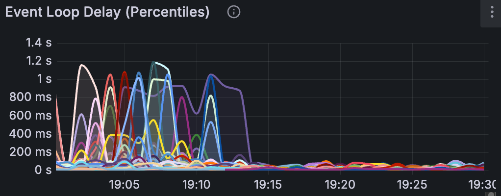 Now for my favorite part, the event loop p99 latency across each of our app instances after we rolled out the fix: