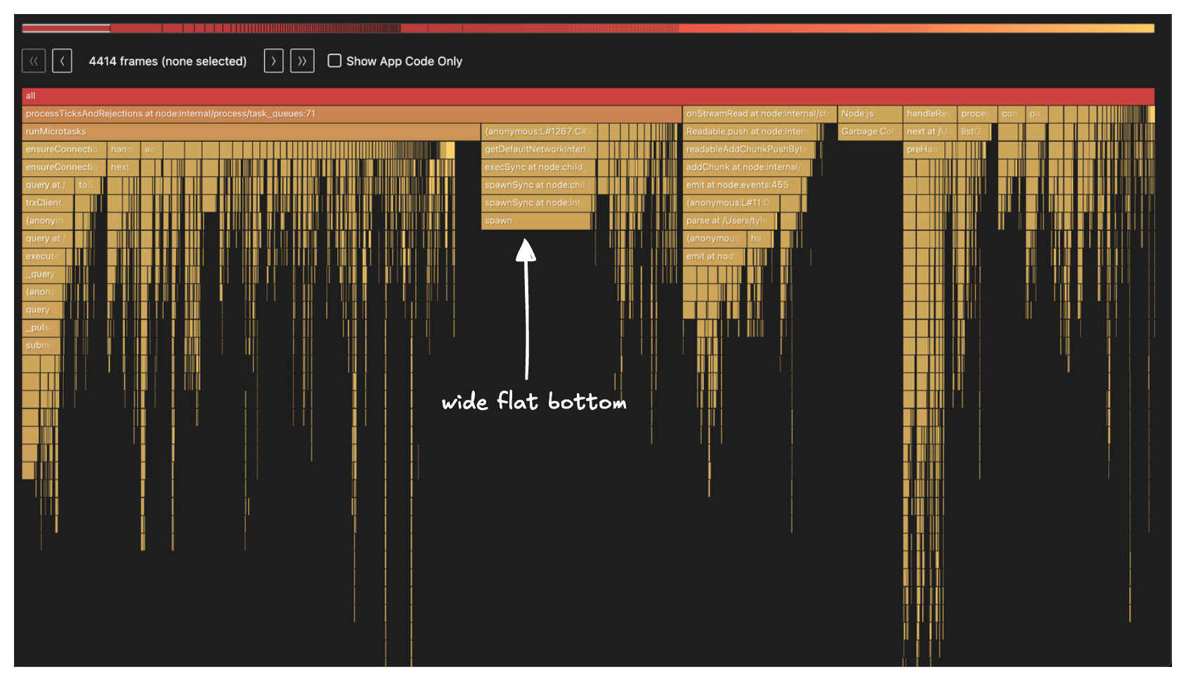 My main mental model when looking at flamegraphs is to look for the widest bottom of the flame. With this in mind, the stack frame labeled spawn caught my eye: