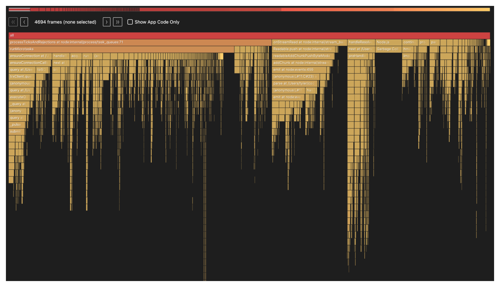 ➜ npx flame generate cpu-profile-2026-03-04T16-04-45-113ZThis produces an HTML and markdown file. Here is what the flamegraph looked like: