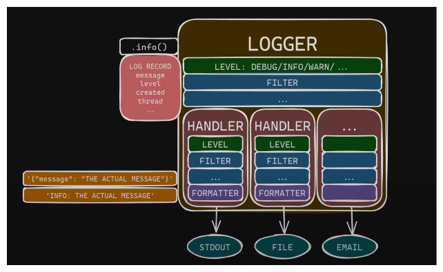 LOG RECORDis a python object so each handler has aFORMATTERthat turns the Python Object into actual text. This is where you can customize what the message will look likeOh no mind blown 🤯 this image is only for the root logger and what you see in the image above can be expanded into a tree of loggers access and created by name.